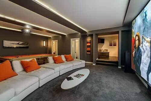 ◊客厅天花板处规划入整齐的暗藏灯槽,并藉由曲度屏幕与长形沙发,复制电影院的豪华享受。