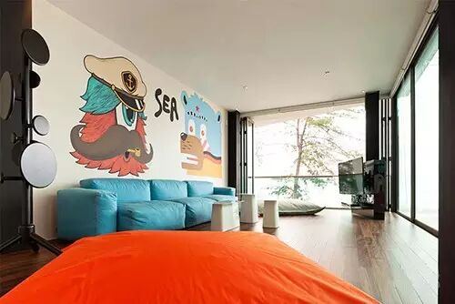 ◊吸睛的幽默卡通形象,运用大胆的配色,将墙面的创意发挥至极致;地面则加以超大软枕,供儿童尽情坐躺、跳跃和玩耍。