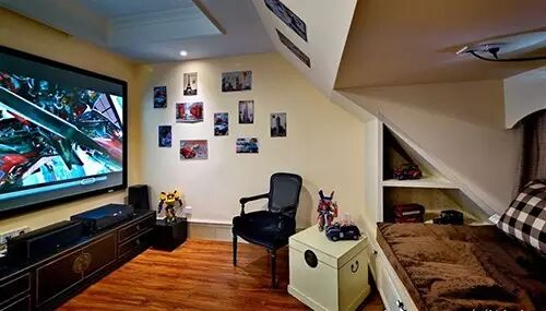 ◊利用阁楼坡度落差,打造小型放映室,屏幕与床体相隔邻近,卧眠状态亦可享受片刻热情。