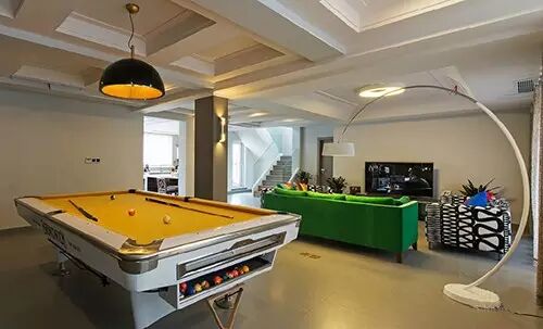 ◊美式吊顶与落地灯揭示雅痞性格,黄绿醒目色调定制空间的清朗层次,空间宽敞,同时包揽视听与桌球的绝顶享受。