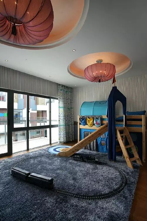 ◊儿童房区域,装置巧思的木制儿童床,佐以绒毛地毯与玩具,打造孩子心目中的梦幻城堡。