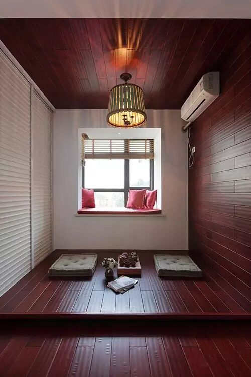 ◊红木墙纸铺设的榻榻米空间,搭佐竹制古典吊顶,从飘窗至地板,皆是自由活动的最佳空间。