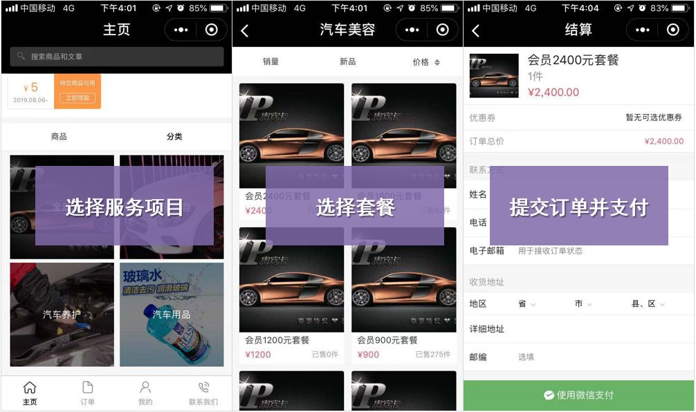 1) 以小程序为载体提供洗车、保养、汽车用品购买等多项服务,顾客可以通过小程序完成服务预约、商品购买等过程。有助于改善洗车行排队洗车、付款的情况。