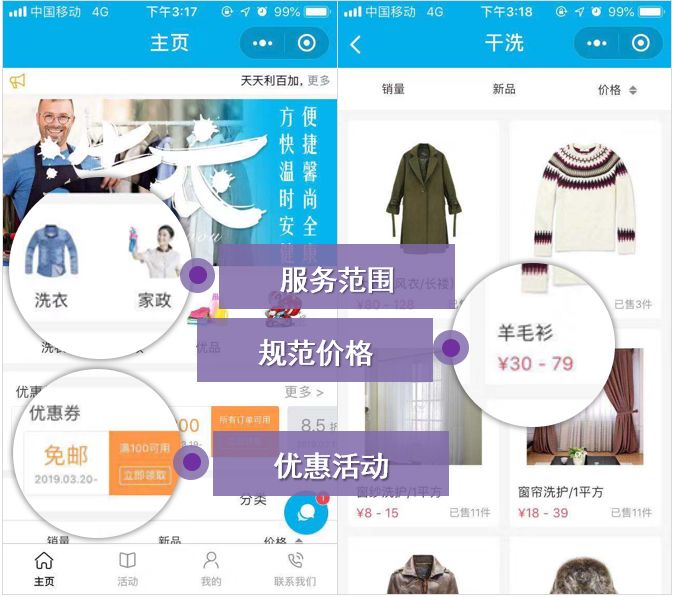 现在,通过小程序的形式将家政服务内容与价格标准化,既有助于家政公司树立规范经营的品牌形象,又为业务线上+线下向客户介绍服务提供便利。