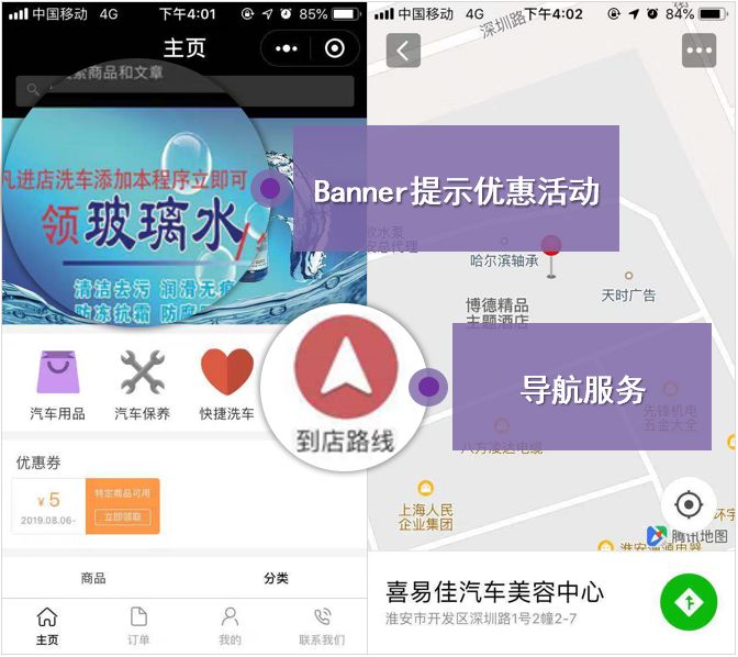 例如:通过banner页轮播,提示顾客关注优惠活动、服务项目;在首页添加导航按钮,方便新顾客快速到店。