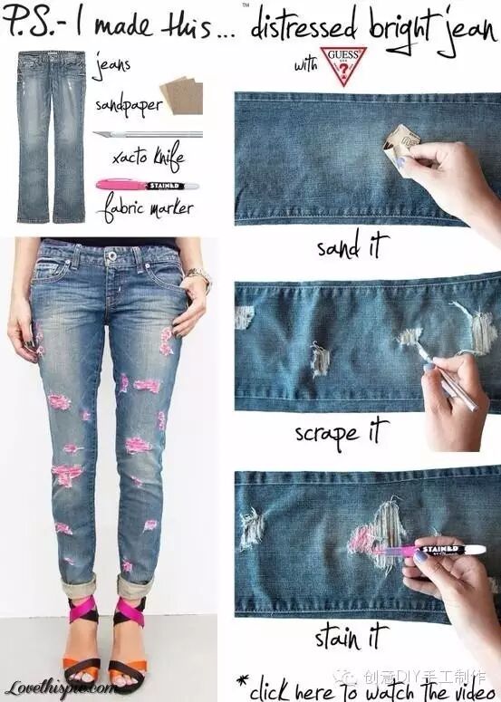 用磨砂纸在裤上面擦白,再用美工刀有裤子上划破(注意不要划太深,最后在破的地方涂上颜色。一条独一无二的潮流之物延生。