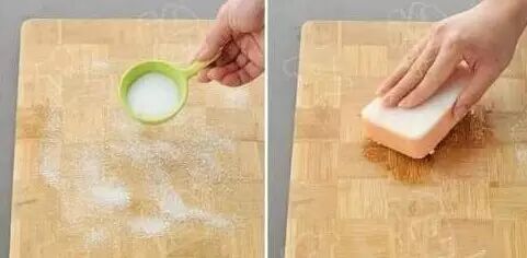 此外,在砧板上洒上一层小苏打粉,再用刷子刷洗一下,可以去除砧板上的污渍。