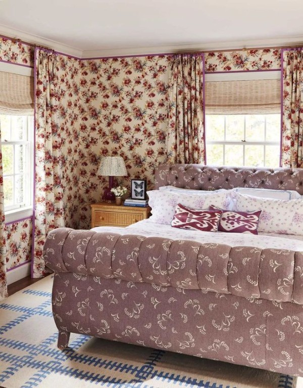 在这间卧室里,定制的软垫床上铺着深玫瑰色亚麻布 ( Carolina Irving Textiles 品牌 ),与之配套的墙纸和布帘花卉印花(DécorsBarbares)向外面丰富的大丽花花园致敬。